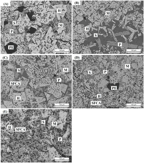 Microstructure of HCVTM sinters with different basicity. (A) R = 1.7; (B) R = 1.9; (C) R = 2.1; (D) R = 2.3; (E) R = 2.5. H: Hematite; M: Magnetite; P: Perovskite; S: silicate; PE: Pore.