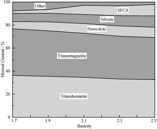 On the one hand, adding more limestone to the sinter brought about an increase in the extent of perovskite formation [18], as can be seen from the results of the quantitative analysis shown in Figure 5. The main minerals were titanomagnetite and titanohematite, which decreased with the increase of basicity. The perovskite content first increased, but when the basicity was 2.1, it began to stabilize, while the SFCA increased rapidly. On the other hand, more limestone meant more endothermic CaCO3 decomposition reactions. The low sinter temperature benefited the generation of SFCA but was unfavorable for the formation of perovskite.
