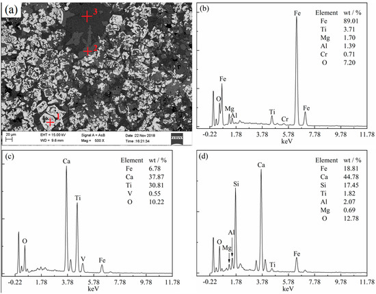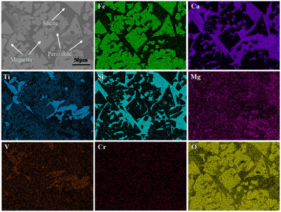 In addition to characterization of the sinter using conventional microscopy, the microanalysis of different phases was carried out using the SEM image and EDS mapping to determine the chemical composition distribution of the various mineralogical constituents of the sinter. The results are summarized as follows and can be seen from Figure 6. It can be seen that the sinter was mainly composed of magnetite, calcium silicate, and perovskite. The magnetite was idiomorphic and hypidiomorpic crystals, which was unevenly distributed. As a result of the high calcium content in the sinter, the perovskite content was high. It was distributed between iron oxides and was the main bonding phase. The silicate content was very low. The distribution of Mg2+ and Fe3+ was consistent. Mg2+ was rarely distributed in the perovskite and the calcium silicate. The Ca2+, Ti4+, and Si4+ were mainly distributed and dissolved in the slag and the liquid phases. The distribution of V4+ was consistent with that of Ti4+, while the distribution of Cr3+ was disordered and in each phase. Mg2+ was mainly distributed in the magnetite and hematite phases, and it was negligible in the perovskite and silicate phases. Perovskite was observed in the gaps between joined crystals of titanomagnetite or titanohematite.