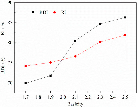 The RI, as the principal indicator for evaluating the metallurgical property of the sinter, is used to simulate the condition for feeding the load from the top of the BF to a high-temperature zone. What is more, it could show the difficulty level of the gas reductant capturing the combination of oxygen and iron in the sinter. The sinter had a good reducing property, which was beneficial to strengthening smelting, and therefore, decreased reductant consumption and the coke ratio. As shown in Figure 7, when the basicity increased from 1.7 to 2.5, the RI increased from 74.2% to 81.9%. According to the mineral phase analysis of the HCVTM sinter, the calcium ferrite, which was easy to be reduced increased while 2FeO·SiO2 decreased with the increasing basicity. In the sinter process, the permeability, the flow rate, and the cooling rate decreased with the increasing basicity, and so did the FeO content. The RI of the sinter increased with the decreasing FeO [19].