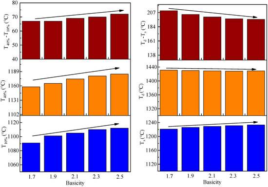 Figure 10 shows the softening-melting properties of the HCVTM sinter with different basicity. The T10% increased from 1091 to 1112 °C and the T40% increased from 1158 to 1184 °C with the basicity increase. The ΔT1 increased from 67 to 72 °C. The Ts decreased from 1241 to 1233 °C and Td decreased from 1431 to 1429 °C with the basicity increase. The ΔT2 decreased from 210 to 196 °C. The ΔPm increased from 10.6 to 14.5 kPa.