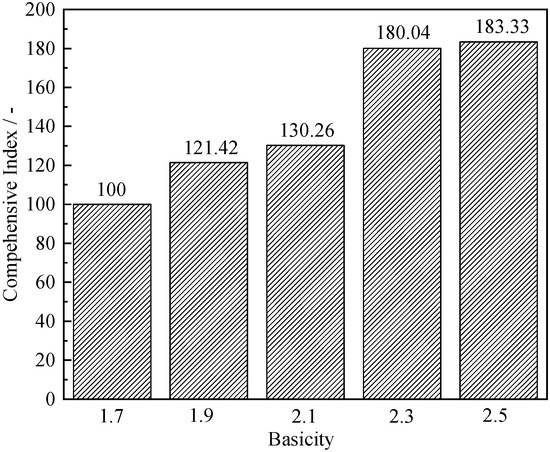 Table 4 shows the calculation process of the comprehensive index value. Figure 12 shows the comprehensive index. As the basicity increased from 1.7 to 2.5, the comprehensive index value increased from 100 to 183.33. There was a large increase from 1.7 to 2.3 and only a very small increase from 2.3 to 2.5. Considering the adverse effect of basicity on softening-melting properties, the best recommended value is 2.3.