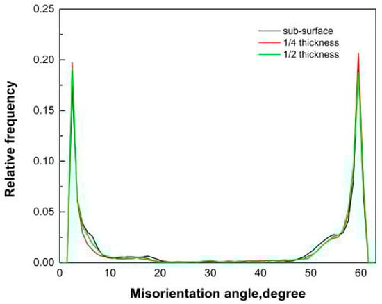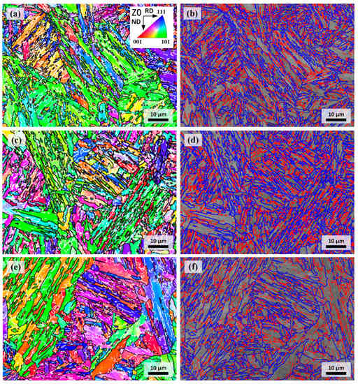Figure 2 shows the crystallographic characteristics of the different thickness positions of the steel by EBSD, where 15° is taken to be the critical misorientation angle to distinguish low-angle grain boundaries (LAGB) and high-angle grain boundaries (HAGB) [10]. The red lines in Figure 2b,d,f represent LAGB of 2–15°, and the blue lines are HAGB higher than 15°. Lath structures were clear in groups of parallel HAGB, which could be referred to as blocks or packets. The average sizes of the blocks were estimated to be 3.77 μm, 4.20 μm, and 4.65 μm for the sub-surface, t/4 and t/2, respectively. This means that the effective grain sizes for strengthening and toughening were increased with increasing depth from the plate surface. The sizes of sub-structures in terms of lath width also exhibited the same trend. Figure 3 plots the relative frequencies of misorientations for the three positions, and the percentages of HAGB were statistically accounted to be 65%, 64%, and 61% for the sub-surface, t/4, and t/2, respectively.