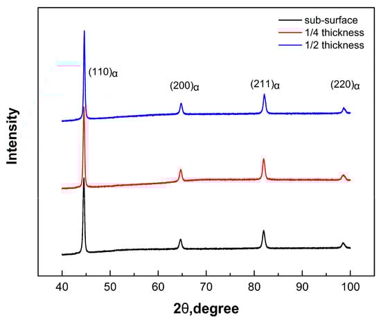where δ, θ, and λ represent the FWHM, diffraction angle, and wavelength of X-rays, respectively. The value of λ is 0.15405 nm for Cu radiation. D, ρ, and b are average grain size, dislocation density, and magnitude of the Burgers vector, respectively. M is a constant of 2, which depends on the effective outer cut-off radius of dislocations [15]. h, k, and l are the Miller indices of each peak, and q is a parameter of dislocation character. According to the method in the literature [16], the dislocation densities were calculated as to be 2.18 × 1014 m−2, 4.17 × 1014 m−2 and 5.12 × 1014 m−2 for the sub-surface, t/4, and t/2 of the experimental steel, respectively.