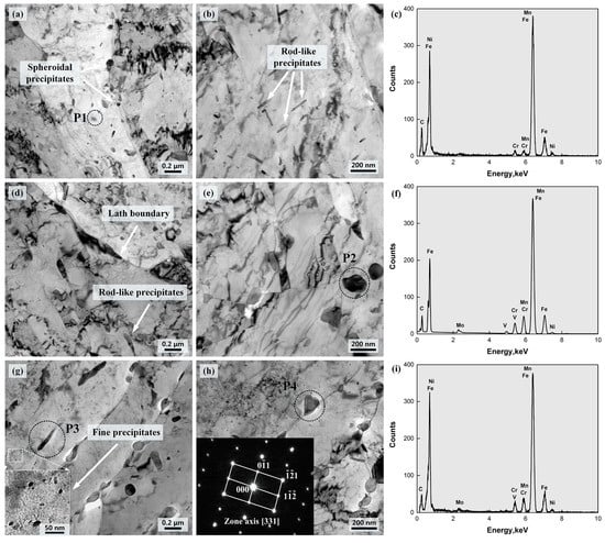 The EDS analysis in Figure 5c shows the spheroidal precipitate P1 which precipitated between two laths was a Cr-rich carbide, and Figure 5i shows that the rod-like precipitates P3 are also Cr-rich carbides, and the V and Mo elements mainly dissolve into Cr-rich carbides. Figure 5e shows that the larger spheroidal precipitate P2, which precipitated at the lath boundaries, is a Fe3C. P4 precipitated at the martensite lath boundaries, and P4 in Figure 5h was identified as Fe3C with a large amount of Cr, V, and Mo by SAED and EDS. Moreover, much finer microalloying precipitates with a diameter of 15–25 nm were observed in the matrix at t/2, which are most likely to be NbC—the dashed rectangle regions in Figure 5g.
