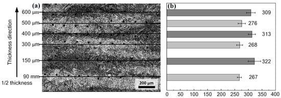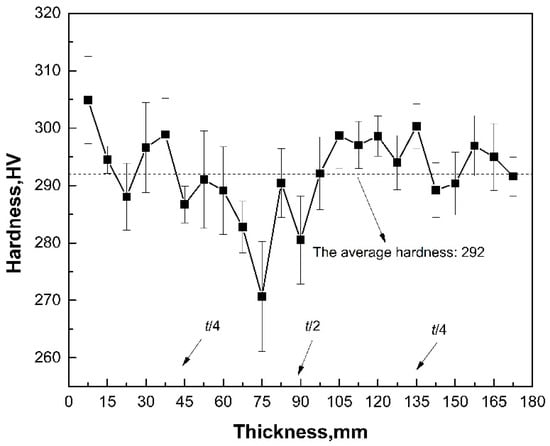 Figure 6 plots the hardness variations across the thickness of the steel, where large fluctuations in hardness were found. The average values changed from 305 HV to 270 HV from the surface position to the middle thickness, where the hardness was the lowest due to insufficient quenching.