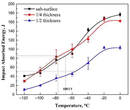 Figure 7 plots the impact energies as a function of testing temperature for the different thickness specimens. As the temperatures decreased from 0 °C to −120 °C, the average CVN dropped from 177 J to 41 J for the sub-surface and from 163 J to 30 J for the t/4, showing a slight difference between the two positions. However, over the whole temperature range, the t/2 had the lowest impact energies, which dropped from 112 J to 11 J, showing a toughness value lower than the sub-surface and t/4. For all the positions, the decreases in CVN are in a linear way from −20 °C to −120 °C, without steep ductile-to-brittle transitions (DBT). The ductile-brittle transition temperatures (DBTT) were estimated as −67 °C, −78 °C, and −56 °C for the sub-surface, t/4, and t/2, respectively, if 50% impact energies of the upper shelf energies were taken as criteria.