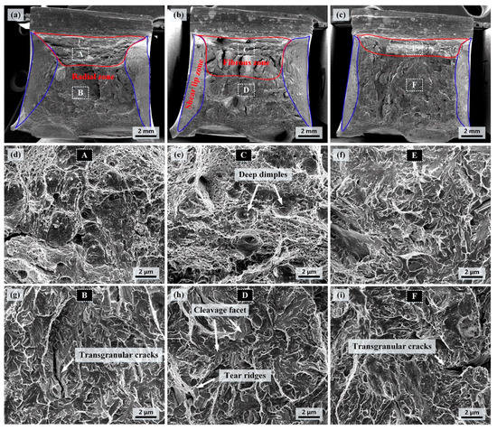 Observations on the fracture surfaces of the impacted specimens at −60 °C were made using SEM for all the positions. The average CVNs at −60 °C were 89.2 J, 100.0 J, and 54.2 J for the sub-surface, t/4, and t/2, respectively. As shown in Figure 8a–c, the specimens were all fractured in a quasi-cleavage mode mixed with ductile and cleavage zones, and the area fractions of fibrous and shear lip were measured to be ~46%, ~54%, and ~30% for corresponding positions. The fracture surfaces of the sub-surface and t/4 specimens showed a high amount of deep and wide dimples, while the appearance of the t/2 specimen was shallow and small, as well as cleavage facets and tear ridges which appeared within the fibrous zone.