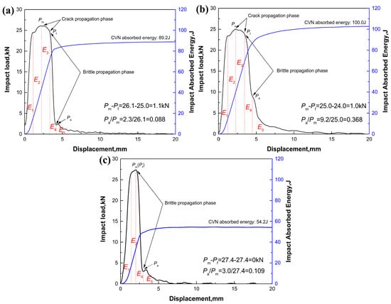 Figure 9 shows the curves of the impact load and the impact energy as a function of hammer displacement at −60 °C. The fracture process can be divided into five stages based on the variation in load including the elastic stage (E1), the plastic (E2) deformation stage for crack initiation, the crack propagation stage (E3), the brittle fracture stage (E4), and the post-brittle fracture stage (E5) [17,18,19]. Table 3 lists the absorbed energy of the crack initiation and crack propagation stage. The crack initiation energy (E1 and E2) were determined to be 44.0 J, 40.2 J, and 33.5 J at the sub-surface, t/4, and t/2, respectively, indicating that the variation from the sub-surface to t/4 can influence elastic and plastic deformation stages to a small extent. However, there were obvious differences in the subsequent crack propagation stage: the crack propagation energy (E3) from the sub-surface to t/2 was 28.4 J, 29.1 J, and 0 J, respectively, which indicates a higher degree of difficulty in the crack propagation process at the sub-surface and t/4 than t/2. The crack propagation stage was not found at t/2, as shown in Figure 9, which means the t/2 subjected to a brittle fracture at −60 °C. Furthermore, the crack arrestability during the propagation stage (Pa/Pm) is stronger at t/4.