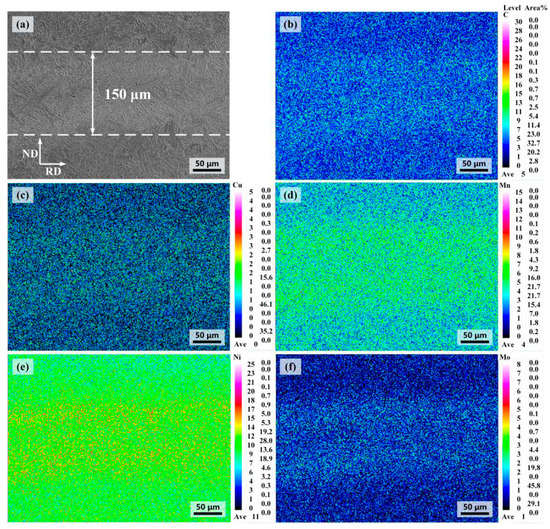 Electron probe microanalysis (EPMA) map scanning results. (a) SEM micrograph of the macrosegregation region, (b–f) the corresponding distribution of C, Cu, Mn, Ni, Mo, respectively.
