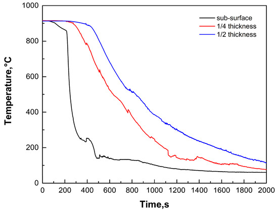 The quenching temperature curves of the sub-surface, t/4, and t/2 of the investigated steel plate were plotted in Figure 12, showing dramatic differences in temperature drop between the positions. Over the range of 600–300 °C, the cooling rate at t/2 was about 0.6 °C/s, much lower that of 6.8 °C/s for the sub-surface position. Combining with the CCT diagram, the measured temperature results will be invaluable to studying the variation of transformation behavior caused by thickness effect.