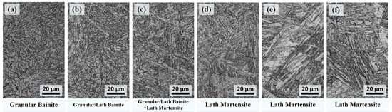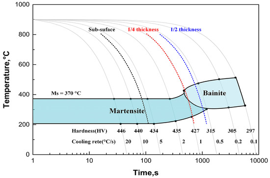 Figure 13 plots the static CCT diagram of the t/2 superimposed with the temperature curves derived from Figure 12, and the corresponding microstructures are shown in Figure 14. The critical cooling rate to make the steel fully martensitic is about 1 °C/s, at which the hardness was increased to 427 HV from 316 HV at 0.5 °C/s. Combining the measured cooling rates for different positions, we can clearly see that the transformed microstructure would be bainitic and partially martensitic at t/2, and fully martensitic at t/4 and sub-surface.