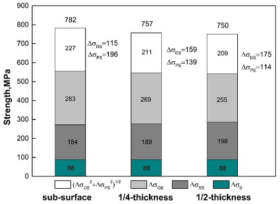 We assume here that the yield strength fully satisfies Equation (2), from which precipitation strengthening can be calculated. With the above approaches, it is possible to quantify the contribution of the strengthening components at the different thicknesses of the heavy-thick steel. Figure 15 shows that the strength variation at the varied positions is mainly due to the strengthening components by effective grain boundaries, dislocation, and precipitation.