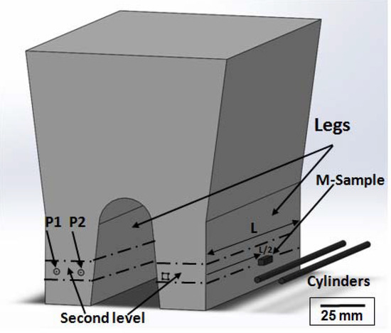 Samples used in this work were machined from the keel block legs as shown in Figure 1. The as-cast microstructure and the microsegregation patterns have been characterized from a sample (named “M-Sample”) obtained from a region located in the second level of the keel block legs, approximately in the middle length (L/2). This region was selected following the criteria of the middle point of the leg, which is the point with a lower thermal influence exerted by the feeder, and the bottom and extreme of the legs. M-sample has a cubic geometry of about 5 mm per side.