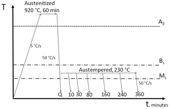 The cooling rate was always 50 °C/s, as this was shown to be sufficient to avoid pearlite formation during cooling after the austenitization step. On the other hand, during the isothermal holding corresponding to the austenitizing or austempering steps, the dilatometer chamber was kept under high vacuum (10−4 mbar) conditions.