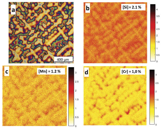 Figure 4 shows a color LOM Figure 4a and EPMA solute concentration maps (b-c-d) for Si, Mn, and Cr. In Figure 4a color etching is able to display already the dendritic solidification structure. For this type of steels, having an average carbon content of ≈0.8 wt. %, the peritectic transformation does not occur and the solidification process starts with the formation of austenite (γ) with a dendritic morphology. In Figure 4a, dendrites of the prior austenite can be clearly observed. Dendrite arms, corresponding to first to freeze zones (or FTF zones), appear as yellow areas, while interdendritic or last to freeze (LTF) zones are the areas with a mix of red, green and blue colors. Figure 4b–d show EPMA maps for Si, Mn, and Cr, respectively. [X] is the average concentration value obtained from EPMA maps for each element “X” (=Si, Mn or Cr).