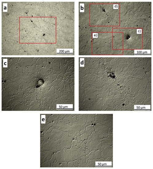 LOM micrographs of the prior austenite grain boundaries revealed by thermal etching. (a) Bright field image of the microstructure at a low magnification; (b) Micrograph corresponding to the red-square in image (a), using Nomarski microscopy (DIC); (c,d) images of interdendritic zones (richer in solute) where non-metallic inclusions and microshrinkage are present and smaller grains can be observed. (e) Image of a dendritic zone (poorer in solute) showing bigger grains.