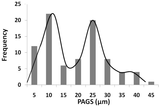 Figure 6 shows the prior austenite grain size distribution of the microstructure shown in Figure 5. As it would be expected, the results depict a clear bi-modal distribution due to the different grain sizes observed in the interdendritic and dendritic regions. According to these results, the approximate average PAGS measured in the dendritic region was 22.4 ± 8.1 µm, while a PAGS of 6.4 ± 2.6 µm was observed in the interdendritic zones.