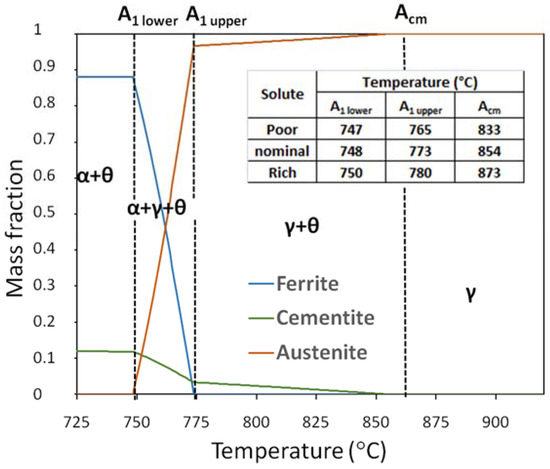 Figure 7 shows the temperature evolution of the mass fraction of the ferrite (α), cementite (θ) and austenite (γ) phases for the nominal composition. In this figure, A1-lower and A1-upper are the critical temperatures that delimit the three-phase region α + θ + γ. Assuming quasi-equilibrium heating, these two temperatures set the start and end of the ferrite into austenite phase transformation in alloyed hypereutectoid steels. ACM sets the temperature at which cementite dissolution is complete and a fully austenitic microstructure is obtained. The inset in this figure highlights the location of the A1-lower, A1-upper, and ACM temperatures for the three compositions.
