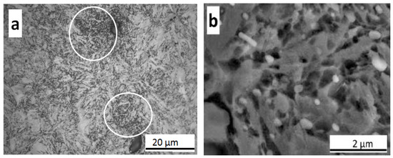 Micrographs of the as-quenched microstructure: (a) LOM and (b) FEG-SEM. Microstructures have been etched with Vilella reagent. The presence of undissolved cementite in the interdendritic regions (small black points in white circle in Figure 8a and light white/grey ellipsoidal particles in Figure 8b) can be observed.
