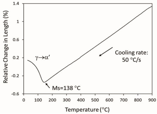 Prior to the selection of the austempering temperature, the determination of the Ms temperature of the steel (corresponding to the start of the austenite, α, to martensite, α’, phase transformation) becomes essential. Figure 9 provides a characteristic high-resolution dilatometry plot obtained during quenching at 50 °C/s after austenitizing at 920 °C (for 60 min). The temperature evolution of the relative change in length during quenching was recorded. The Ms temperature can be defined as the temperature where, due to the formation of the martensite, the length change of the sample deviates (expands) from that expected quasi-linear austenite contraction behavior [66]. The martensite phase has a specific volume which is larger than that of austenite, reason why an expansion is observed [37,38,66]. In this work, an offset corresponding to a strain of 0.02% generated by the formation of martensite was adopted. Following this methodology, the overage Ms temperature was estimated to be 138 ± 10 °C after performing three independent experiments.
