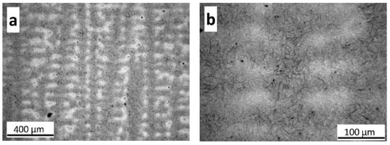 The etching with Nital 2% is also able to reveal the dendritic solidification pattern; the lighter zones in Figure 10 correspond to the interdendritic zones (richer in solute) while the darker/grey regions correspond to the dendritic zone (poorer in solute). As can be observed, larger non-metallic inclusions and voids (black dots) are located mainly in the interdendritic regions, which are the last zones to solidify.