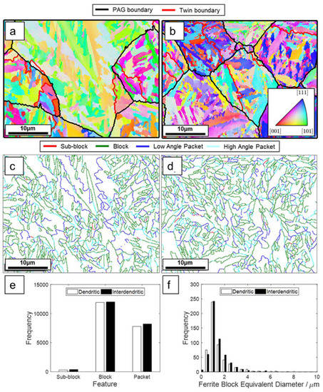 (a,b) Ferrite IPFZ maps for dendritic and interdendritic regions, respectively, where the prior austenite grains boundaries (PAGB) are represented by black lines, and the red lines are the twin boundaries. Note that all pixels seem to be ferritic as the data has been subjected to noise reduction techniques for a cleaner representation. (c,d) EBSD misorientation maps for dendritic and interdendritic regions, respectively; (e) Frequency chart showing the frequency of the different types of boundaries characteristic of sub-blocks, blocks and packets; (f) Frequency histogram showing the ferrite block equivalent diameter frequency for both dendritic and interdendritic areas.