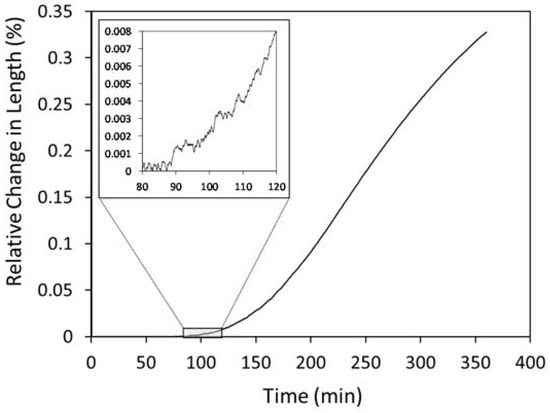 Time dependent evolution of the relative change in length during an austempering treatment at 230 °C for 360 min.