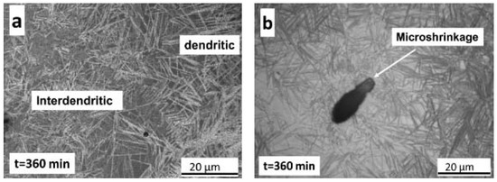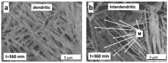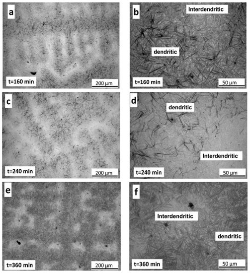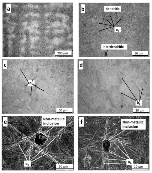 Figure 13 shows LOM and FEG-SEM images corresponding to a sample austempered for 80 min and then quenched to room temperature. Figure 13a has been taken at low magnification to show the microsegregation pattern. Figure 13b–d are higher magnification images showing, in Figure 13b: dual dendritic/interdendritic zones and, in Figure 13c,d: only dendritic zones. Finally, Figure 13e,f are high magnification FEG-SEM images where the nucleation of bainitic ferrite on inclusions was observed.