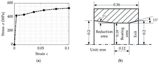 In the simulation, the material of wire is selected as TA2 commercial pure titanium, the density, elastic modulus, and Poisson ratio of which are 4500 kg/m3, 115 GPa, and 0.37, respectively. The wire drawing die mainly consists of two sections: a stainless casing and the diamond nib [21]. In the FE model, only the nib section, which directly contacts the wire, is considered. The diamond mandrel, with 3520 kg/m3, 1100 GPa, 0.07, respectively, in density, elastic modulus, and Poisson ratio, could be divided into three areas: the reduction area with the semi-cone angle of 7°, the bearing area, and the exit area. Plastic deformation mainly occurs in the reduction area; however, the bearing area is essential for maintaining the dimensional accuracy of the wire products. The stress-strain curve of TA2, as well as the geometry and dimension of the diamond nib, is shown in Figure 2. The plastic deformation of the titanium is assumed to follow the Mises yield criterion, and a multi-linear kinematic hardening (MKINH) model was employed to describe the plastic behavior of the material [22]. Considering the changing stress state at the wire-die interface caused by the oscillation of the die, the simulation process involves not only material nonlinearity, but also nonlinear geometry and boundary conditions; therefore, the transient analysis is conduct in the Abaqus/Explicit module to improve the efficiency and convergence of the calculation.