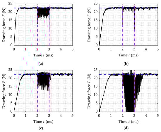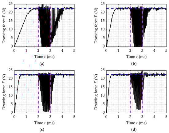 Influence of drawing speed on time-variation of the drawing force with reel-die distance of 126.4 mm: (a) V = 200 mm/s; (b) V = 400 mm/s; (c) V = 600 mm/s; (d) V = 800 mm/s.