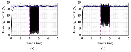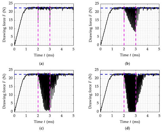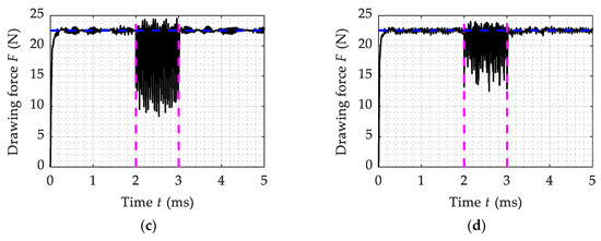 Figure 5 illustrates the changing of wire drawing force along with time at the drawing velocity of 300 mm/s and with the friction coefficient of 0.1. It can be found that the upper limit of the drawing force remains around 22.5 N, which will not be affected by the intensity of ultrasonic vibrations. In Figure 5a, where ultrasound amplitude is 2 μm, there is almost no change in drawing force compared with the conventional drawing value, because the drawing speed, 300 mm/s, exceeds the threshold value 2πfA, which is determined by the oscillation amplitude and frequency of the die. In other subfigures, where pre-condition is satisfied, an obvious decrease in drawing force can be observed. The envelope lines of ultrasonic drawing force present the shape of the triangle or trapezoid instead of rectangular, as the die locates half-wavelength off the reel drum, which is consistent with previous analysis. The influence of ultrasound will also last for a short time after the die stops vibrating, instead of disappearing instantly. However, the fluctuation range of the ultrasonic drawing force will be widened with the increment of ultrasonic amplitude. When ultrasound is turned on, the minimum values of the drawing force go down consistently until arriving at the stable phase. The time consumption for this period is shortened with larger ultrasonic amplitude, and the decrement of minimum drawing force for each oscillation period will be enlarged correspondingly.