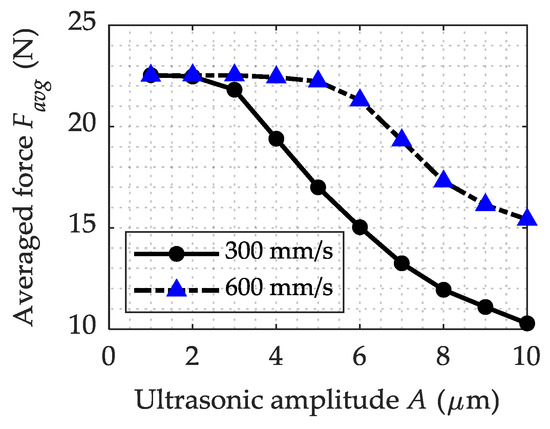 Figure 6 shows the numerical calculation results of averaged ultrasonic drawing force under different ultrasonic amplitudes at drawing speed of 300 mm/s and 600 mm/s, respectively. Overall, the two variation curves show the same trend, that is, the averaged ultrasonic drawing force goes down with the increment of ultrasonic amplitude. However, the drawing force declines faster at a relatively lower drawing speed of 300 mm/s. A flat section could be found at the initial segment of the two curves, where there is almost no reduction in drawing force compared with 22.5 N. Therefore, at a certain drawing velocity, to achieve drawing force reduction, the intensity of ultrasonic vibration has to be large enough. The flat region expands at a relatively higher drawing velocity because the threshold drawing speed (V = 2πfA) increases with ultrasonic intensity.
