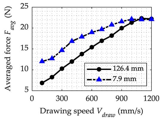 FEM calculation results of average ultrasonic drawing force with different drawing speeds with reel-die distance of 126.4 mm and 7.9 mm.
