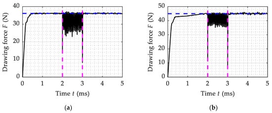 It can be seen that the whole drawing process lasts for 5 ms. Ultrasonic vibrations were imposed during the period of 2~3 ms and then were removed. At the beginning of the first 2 ms, the drawing force ramped up from 0 N to around 20 N within 1 ms, which represents the elastic deformation phase of the wire drawing process. Afterward, the growth of the drawing force gradually slowed down, which means the start of plastic deformation. The drawing force finally stabilized at around 22.5 N, and wire products were steadily pulled through the die. Comparing Figure 3a,d, we can easily find that the distance between the die and the wire does not influence the conventional drawing force, however, it would affect the duration of the elastic deformation period. When ultrasonic vibrations were applied, the drawing force began to fluctuate in a certain range, with the maximum values slightly larger than or equal to the normal drawing force, whereas the minimum values are significantly lower than that, which results in a decrease in averaged drawing forces. The fluctuation range of ultrasonic drawing force, or the reduction ratio of averaged ultrasonic drawing forces compared to the conventional drawing value, is heavily influenced by the location of the die. Specifically, at the same ultrasonic amplitude and drawing velocity, the drawing force fluctuates most violently when the reel locates 126.4 mm (λ/2) from the die, while the fluctuation is the minimum when the reel-die distance equals 63.2 mm (λ/4). Besides, there is a difference between the four subfigures with respect to the envelope curve shapes under the ultrasonic drawing condition. When the die is distributed λ/2 from the reel, the envelope of the ultrasonic drawing force is shaped like a trapezoid, instead of rectangular when located at other positions. For these positions, the amplitudes of drawing force fluctuation reach the maximum as soon as ultrasounds are imposed, and the drawing forces immediately restored to around 22.5 N when vibrations are removed. At the half-wavelength position, however, the minimum drawing force drops steadily in the first five oscillating cycles before reaching a steady state. When ultrasound is removed, the drawing force remains lower than 22.5 N in about 0.7 ms, instead of going back to the original value right away. Finally, even in the half-wavelength condition and even without the consideration of the pliability of the metallic wire, the ultrasonic drawing forces remains above 0, which means no separations occur between the wire and die at their contact interface, and the validity of the presuppositions for reversed friction mechanism should be further verified. Unlike a bar, a long thin wire could not bear the pressure, which is another reason why the drawing force stays above 0 and the separation could not happen.