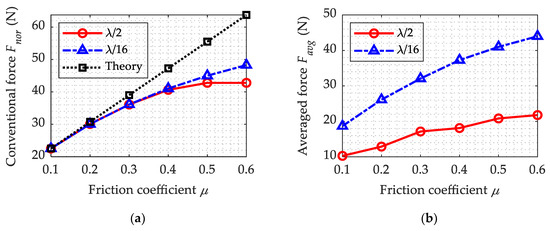 Figure 12 illustrates the influences of friction coefficient on conventional and ultrasonic drawing forces. In both subfigures, the drawing forces ascend with an increased friction coefficient. For conventional drawing, the simulation results are in good agreement with a friction coefficient below 0.4 and are consistent with theoretical results calculated according to Avitzur’s theory, when the friction coefficient is lower than 0.2 [23]. For ultrasonic drawing, the drawing force curve has the same shape with the conventional drawing force curve when reel-die distance equals λ/16. However, at the half-wavelength condition, the increment of ultrasonic drawing force is much smaller than that of conventional drawing force, which means a decreased equivalent friction.
