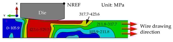 Figure 13 depicts the Mises equivalent stress distribution of titanium wire under conventional drawing conditions with drawing velocity of 300 mm/s and friction coefficient of 0.1. In the contour, the equivalent stress remains 0~105.9 MPa in a large portion of the feeding area, which locates to the left of the die, when the influence of the back-pull force is neglected. At the entrance region, the Mises stress surged to around 423 MPa. The maximum stress 423.6~529.5 MPa occurs at the reduction area and bearing area, where the die is in direct contact with the wire. However, at the bearing area and the right adjacent area to it, the maximum stress only concentrates on the outer layer of the wire. These are mainly residual stresses caused by the inhomogeneous deformation between the surface and core section of the metallic wire, which declines sharply along the radial direction (−X) of the wire. At the reduction area, however, the equivalent stress maintains 423.6~529.5 MPa throughout the whole internal region of the wire. This is where plastic deformation mainly occurs. For the wires far from the right side of the die, the drawing stress is kept between 211.8 MPa to 311.7 MPa.