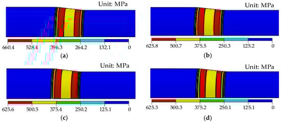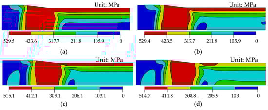 Mises equivalent stress distribution of the wire at the contact region under ultrasonic drawing conditions when the die locates 15.8 mm from the reel and in various motion states: (a) Equilibrium position and moves to left; (b) Left extreme position; (c) Equilibrium position and moves to the right; (d) Right extreme position.
