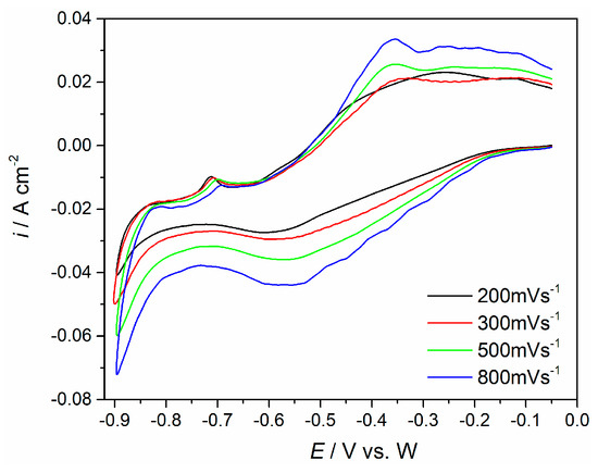 The voltammograms obtained using various scan rates on the Mo electrode, from the NdF3–LiF molten salt electrolyte, are presented in Figure 2. In the potential range between −0.05 V and −0.90 V, two cathodic current waves can be registered and attributed to the reduction of Nd ions: a broad cathodic wave at around −0.55 V, and its anodic counterpart at ≈−0.35 V; and a second cathodic peak starting at around −0.83 V, and its anodic response at ≈−0.70 V. These voltammograms suggest that the cathodic and anodic processes recorded reflect the deposition and dissolution of the Nd metal on the cathode [18,20,25].