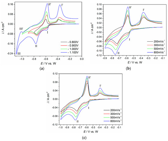 Cyclic voltammograms recorded on Mo working electrode in NdF3–LiF + (2 wt.%) Nd2O3 molten salt electrolyte, at 1323 K: (a) v = 500 mV·s−1, potential range was from −0.10 V to a different cathodic end potential; (b) potential range from −0.10 V to −0.90 V scanned with different sweep rates; (c) potential range from −0.10 V to −1.00 V scanned with different sweep rates.
