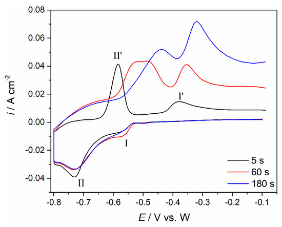 In the second procedure, the same potential range was scanned with a sweep rate of 100 mV·s−1, but the scan was interrupted when the potential reached −0.80 V; and this potential was held for 5, 60, and 180 s before starting the return scan.