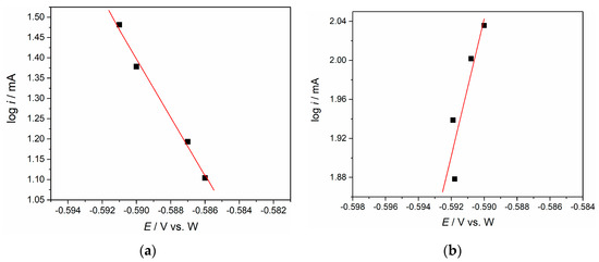 The data recorded in Figure 3 offers the possibility of establishing the number of exchanged electrons in the reversible reactions represented by the peak pairs, I/I′ and II/II′ [18,34]. Figure 6 provides a graphical presentation of the function log iP = f(EP), obtained by correlating the values of the peak current logarithms with the peak potentials recorded for different potential scan rates in Figure 3. The logarithms of the current density values characteristic for the cathodic (I) peak potentials recorded for four different scan rates are plotted in Figure 6a. Figure 6b shows the results of the same procedure applied to the anodic peak (II′). The dissolution peak was used to additionally support the claim for the reversibility of the Nd(II) ↔ Nd(0) reaction. According to the deliberations already mentioned [18,34], the slope K of the functions log iP = f(EP) graphically presented in Figure 6 is defined as: