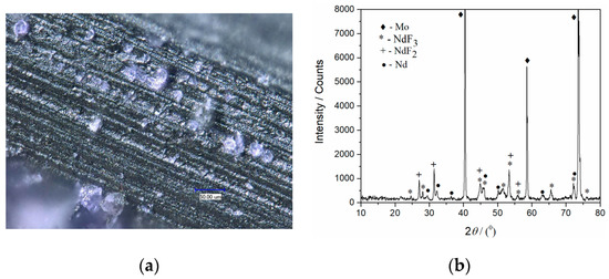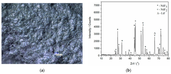 (a) Optical image of the Mo WE with closely attached electrolyte after deposition at −0.80 V for 7200 s, in molten NdF3–LiF–Nd2O3 electrolyte system, at 1323 K (200×); (b) XRD spectra of the electrolyte layer on the Mo electrode from Figure 8a.