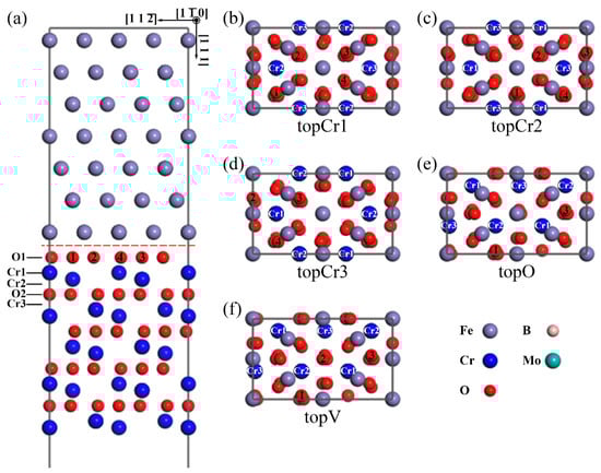 In our previous work [17], the effect of B on the segregation of Mo at grain boundaries was studied by first-principles calculations. The results showed that B can restrain the segregation of Mo at grain boundaries to reduce the precipitation of the σ phase. However, the effects of B on Mo at the metal/oxide interface have not been discussed yet. Moreover, the effects of B on the composition of the passive film and the interfacial adhesion play a significant role in corrosion resistance. In addition, it is hard to observe the effect of B on the diffusion of Mo by means of existing characterization methods. Therefore, in this work, first-principles calculations were adopted to study the segregation behavior and the interfacial adhesion of the Fe–Cr/Cr2O3 interface and to explore the reason for this from the perspective of charge interaction.