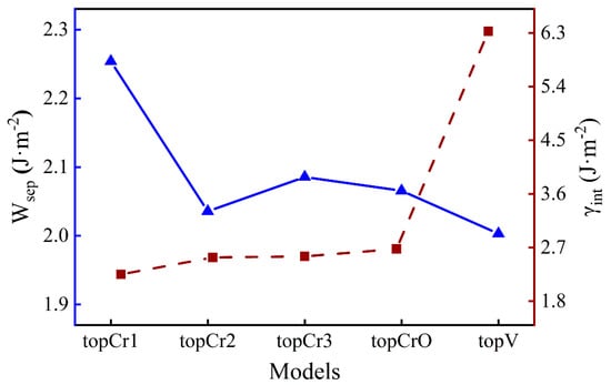 where is the total energy of the interface; and represent the energy of the Fe and Cr2O3 surfaces, respectively; and are the total energy of bulk Fe and Cr2O3 in their formula unit, respectively; and x and y correspond to the number of unit cells in the interface. The lower values means the better thermodynamic stability of an interface. The results of and for different O-terminated interfaces are shown in Figure 2. The topCr1 construction has the highest work of separation (2.25 J·m−2), while there are fewer differences among the other four. The interface energy of the topV structure (6.33 J·m−2) is around 2.5 times the value of the others, which is much larger than the difference in work of separation. This suggests that vacancy defects can significantly reduce the stability of the interface rather than greatly weaken the interfacial adhesion strength. It will take a lot of computation time to study the segregation behavior of all interface configurations, so it was necessary to choose one typical case. As the highest and the lowest , the topCr1 interface model was chosen as the structure in focus for the following discussion.