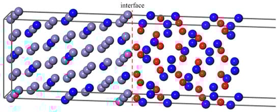 In order to make the simulation closer to the actual composition of super austenitic stainless steel, 13 Cr atoms replaced Fe atoms in the Fe–Cr substrate as uniformly as possible. From Figure 3, the Cr atoms are uniformly distributed, and are neither adjacent to the interface nor clustered. According to one previous study [53], B was placed in interstitial sites of γ–Fe to explore the effect of alloying on the behavior of B and S at the grain boundary. We computed the formation energy of B in Fe or Cr2O3 bulk, as shown in Table 1. According to the most energetically favorable sites, we placed B in the octahedral interstitial sites of fcc–Fe and the substitutional sites of the oxide, respectively, to study its segregation behavior.