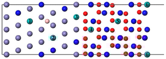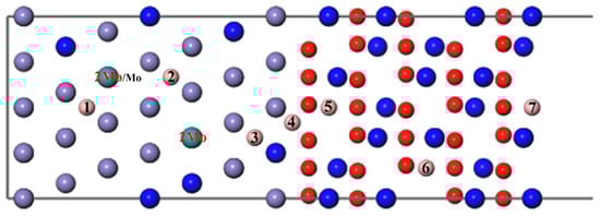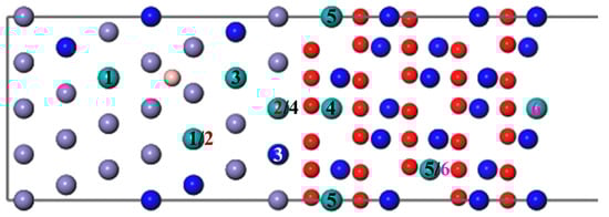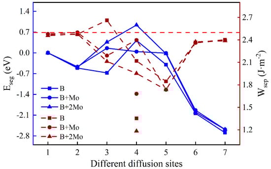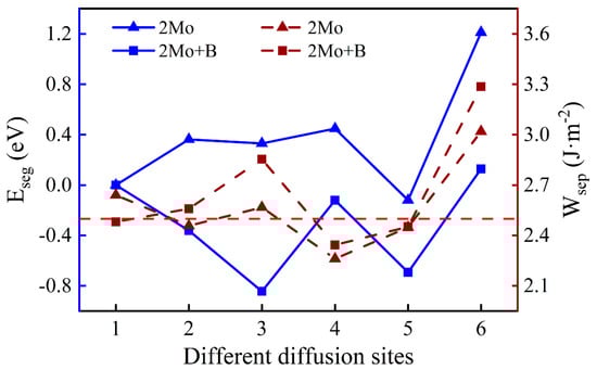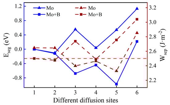 As shown in Figure 6, we introduced a Mo atom with a B atom located at the most stable site, where numbers 1–6 indicate the different diffusion substitutional sites of Mo. The mass fraction of a Mo atom in the substrate is about 3.07%. The segregation behavior and the interfacial adhesion of the interface with a Mo atom at different sites can be assessed by the segregation energy and the work of separation, respectively, as shown in Figure 7. From Figure 7, it can be seen that the values of a Mo atom with B are more negative than that without B. Furthermore, the segregation energy of Mo from the substrate (Site 1) to the interface (Site 3) becomes gradually more negative, indicating that Mo can spontaneously segregate to the interface (Site 3) under the effect of B. However, the negative
