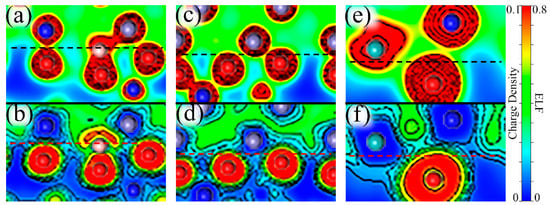 The charge density describes the distribution of valence electrons, which can mirror general bonding situations and the strength of atomic interactions. The electron localization function (ELF) can easily reveal types of bonding and the distribution of lone electron pairs. The value of ELF is limited between “0” and “1”, where “1” signifies complete electron localization and “0” corresponds to complete electron delocalization or no-electron domain [54,55,56]. The value ELF = 0.5 represents electron gas-like pair probability. Therefore, charge density and ELF were computed to explore the atomic interactions and electronic bonding properties. The computed results near the interface are shown in Figure 10, which can be divided into three situations: A single B atom at the interface, a Mo atom in the middle of the oxide, and two Mo atoms near the interface in the substrate with B added.
