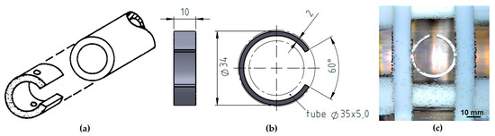 C-ring samples, position in the initial extruded tubes (a), sketch with dimensions (b) and during stress corrosion in the polyoxymethylene (POM) apparatus (c).