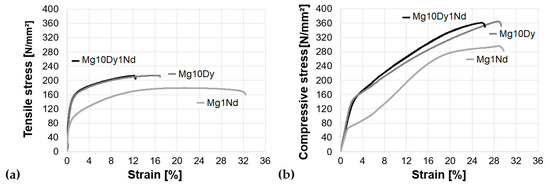 Stress–strain curves for the Mg10Dy1Nd, Mg10Dy and Mg1Nd alloys under tension (a) and compression (b).